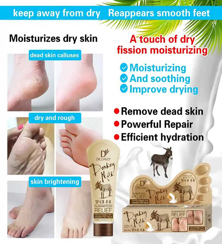 کرم رفع ترک پا دکتر دیوی DR.DAVEY سازنده P.R.C حجم 100 گرم حاوی شیر الاغ Donkey milk مناسب برای پوست های خشک و خشن از بین برنده ترک نرم و لطیف شدن کف پا